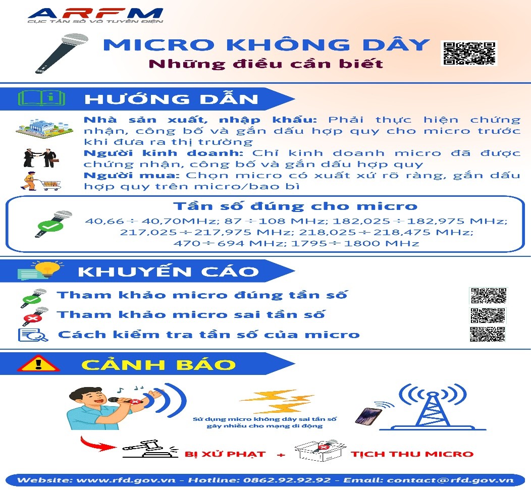 Cục Tần số vô tuyến điện đã phối hợp với các Sở Thông tin và Truyền thông (nay là Sở Khoa học và Công nghệ) bằng hệ thống thông tin cơ sở/các tổ công nghệ số cộng đồng/tổ dân phố/thôn tại địa phương tuyên truyền đến người dân không quảng cáo, kinh doanh và sử dụng thiết bị vô tuyến điện bất hợp pháp, trong đó khuyến cáo khi mua micro không dây cần kiểm tra rõ nguồn gốc xuất xứ, phải được gắn dấu hợp quy (gắn trên micro hoặc bao bì…).