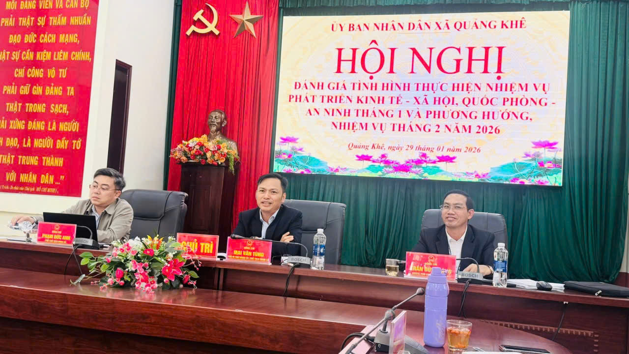 Sáng 29/01/2026, UBND xã Quảng Khê tổ chức hội nghị đánh giá tình hình thực hiện nhiệm vụ phát triển kinh tế – xã hội, quốc phòng – an ninh tháng 01 và triển khai phương hướng, nhiệm vụ tháng 02 năm 2026. Hội nghị do đồng chí Mai Văn Tùng – Phó Bí thư Đảng ủy, Chủ tịch UBND xã chủ trì; đồng chủ trì có các đồng chí Trần Duy Tráng – UVBTV Đảng ủy, Phó Chủ tịch UBND xã và Phạm Đức Anh – Đảng ủy viên, Phó Chủ tịch UBND xã.